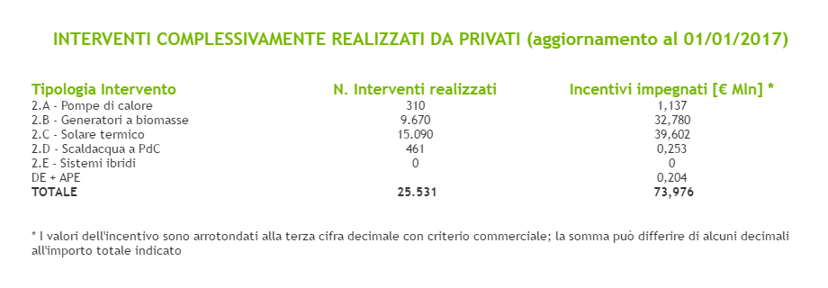 In buona sostanza dei 700 milioni previsti per interventi effettuati da soggetti privati (persone fisiche ed aziende) si è sfruttato solo il 10% delle somme a disposizione. La ns. speranza è che nel 2017 le richieste di incentivo del Conto Termico 2.0 aumentino esponenzialmente.